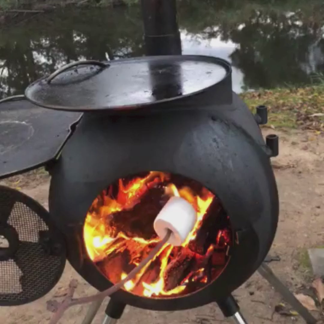 • Dimensions (packed): 42L x 36.9W x 40Hcm • Dimensions (set up): 66.5L x 53W x 149Hcm • Height (ground to top of chimney): 154.5cm • Height (ground to cooking surface): 70.5cm • Width (side to side): 55cm • Cooking Surface: 26cm diameter round plate & 34cm x 25.5cm large plate • Weight: 18kg • Door Opening: 183mm Diameter • Chimney Length: 3 x 300mm pieces • Chimney Diameter: 58mm